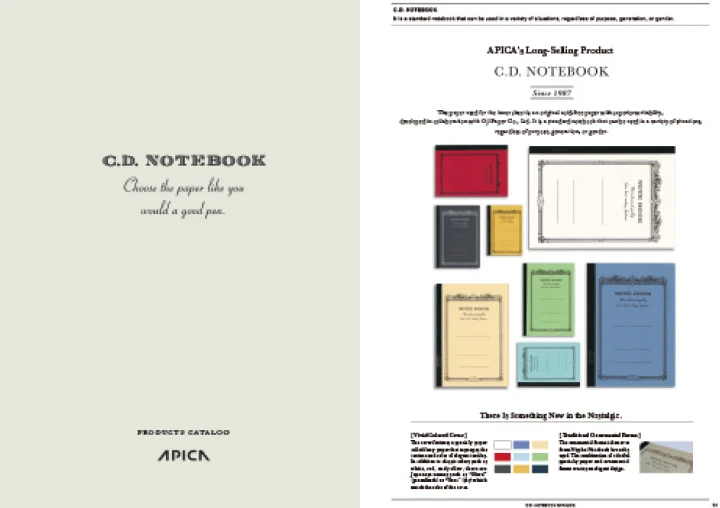 The classical design is reminiscent of an old book cover. Its trademark is the ornamental flame, which has been passed down for more than half a century. Different colors are used for the ornamental flame, depending on the cover color in order to give each notebook its own personality. The black back tape brings out the vivid colors on the cover, tying the whole series together. Each A4, B5, and A5 notebook has a product code (e.g. “CDXX”) stamped in gold leaf.